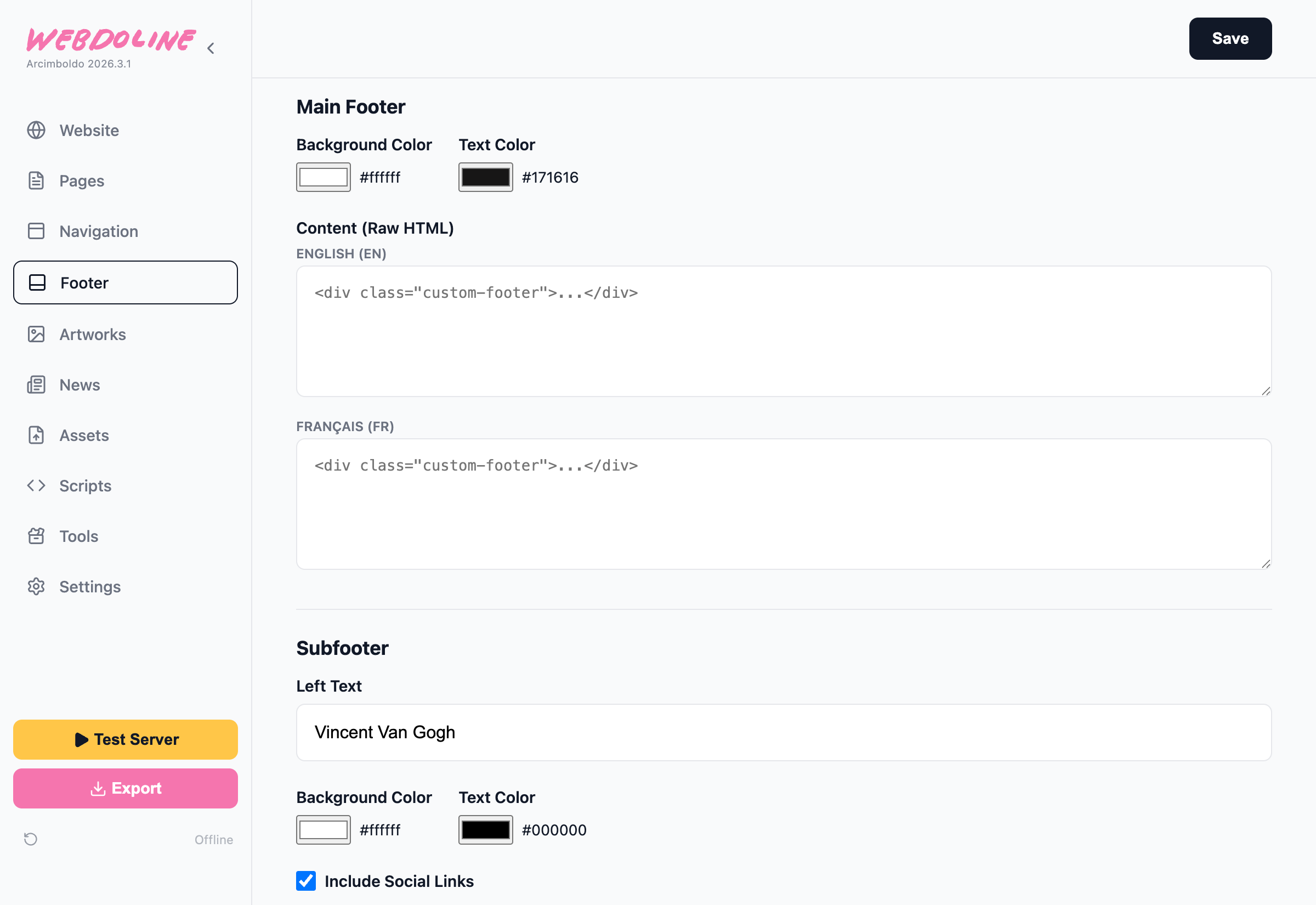 - Social. If you added social links in the Website section, you can show them on the subfooter when checking the checkbox.