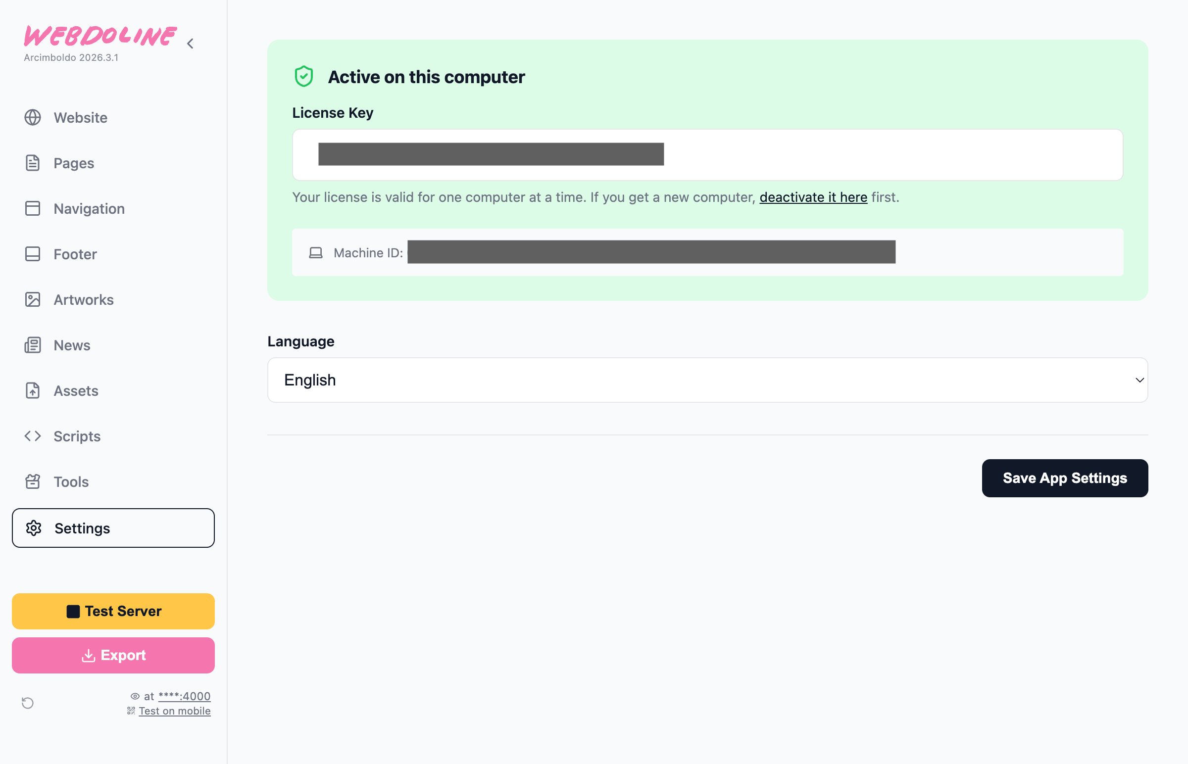 This is were you enter the key you get when buying a Webdoline license. You need a key to be able to buid your website. Without key you can still use the app and evaluate if it meets your needs. Also you can still use the Tools section and download the content/files generated there.
